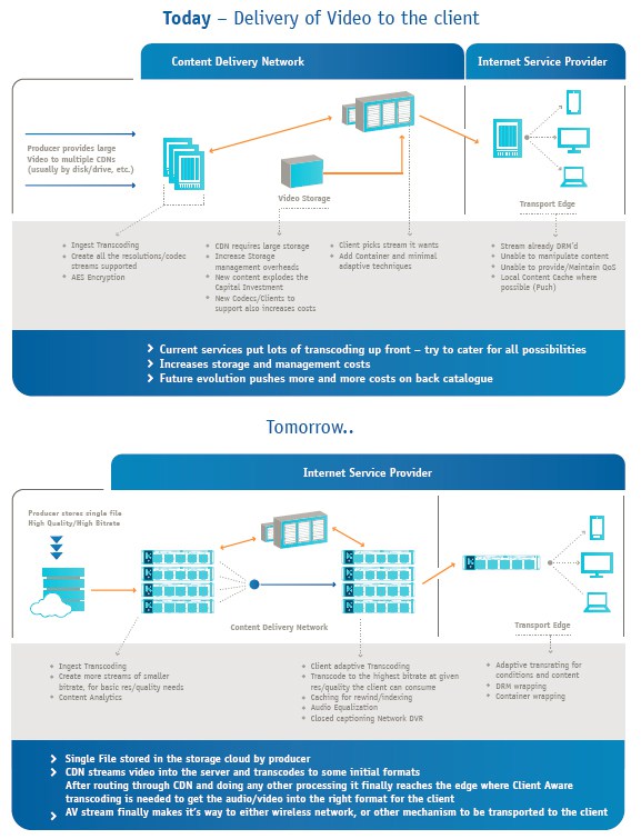 For example, new cloud-based video networking topologies enable video broadcasters and service providers to reduce CapEx. They enable cloud storage and delivery of single, high-quality, high-bit-rate video files in multiple formats, which frees service providers from the expense of purchasing and maintaining their own network servers. In addition, content delivery networks can pull video from a single source– the cloud, which adds security, privacy and protection to the content while it is being stored or transported. Properly equipped next-generation, video-centric networks also employ pre-emptive transcoding, caching and video analytics that make it possible to expedite client-specific delivery and consumption of video. This also allows service providers to seamlessly enhance their video streams and monetize them in a manner that is not possible in today’s networks.