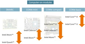 The easiest way to scale is within a product. If you take a look on any of our standard boards, which are motherboards or Computer-on-Modules, there are different variants available. For example in mITX-E38, our Baytrail based motherboard we have 3 different variants (SKUs) with a quad core, a dual core and a single core processor available. On our COMe mini Module COMe-mBT10 we have in addition to different CPUs also different options for RAM, flash and more. This variety is made possible by 9 different CPUs, 8 x RAM, 10 x Flash, 5 different options like a TPM (“Trusted Platform Module”). All in all, there are 23.040 configurations possible. Out of this variety we have created 12 SKUs with a standard configuration but any possible configuration can be created for our customer on a project base.