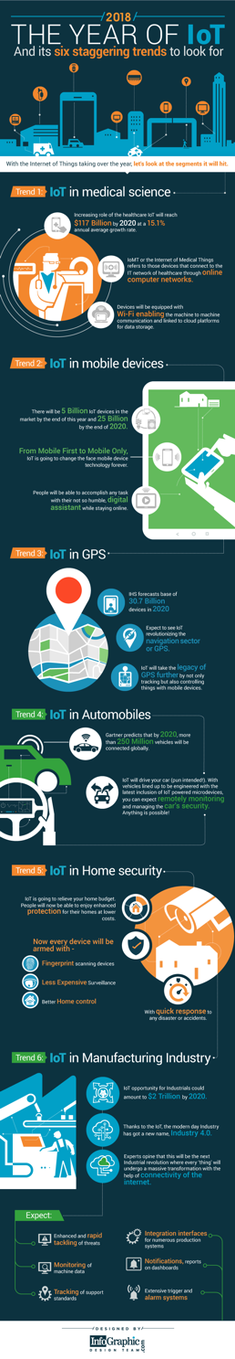 There is no denying that IoT, IIoT and Industry 4.0 have gained momentum in the meantime. The American design agency Infographic Design Team even sees 2018 as an important transitional year for the breakthrough of the IoT. Based on its surveys, the company has identified the six currently most important trends, as the business magazine Wirtschaftswoche reported a few weeks ago. Details on the market segments and the forecast sales are shown in the following information graphic.