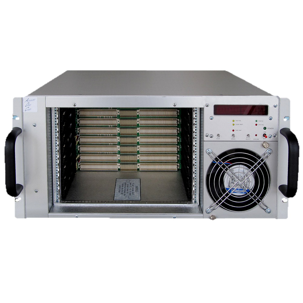 | Features | Compliant with VME standard (ANSI/VITA) 9-slot configuration (1 system + 8 user slots) Redundant hot-swappable 250 W cPCI power supplies 6U height, available for rack-mount or desktop use Remote monitoring and control via Ethernet/USB shelf manager Rugged steel chassis with advanced cooling for long-term reliability |