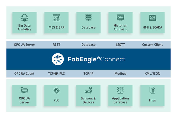 Contact SupportFabEagle®Connect enables you to integrate configurable and reliable data interfaces such as OPC UA, REST or TCP/IP to machines and IoT applications. Regardless of the age or manufacturer of your production machines and devices, you can ensure that the IT requirements for seamless integration of interfaces are met as the level of automation increases. FabEagle®Connect uses modular components that cover both interface protocols and data transformation.