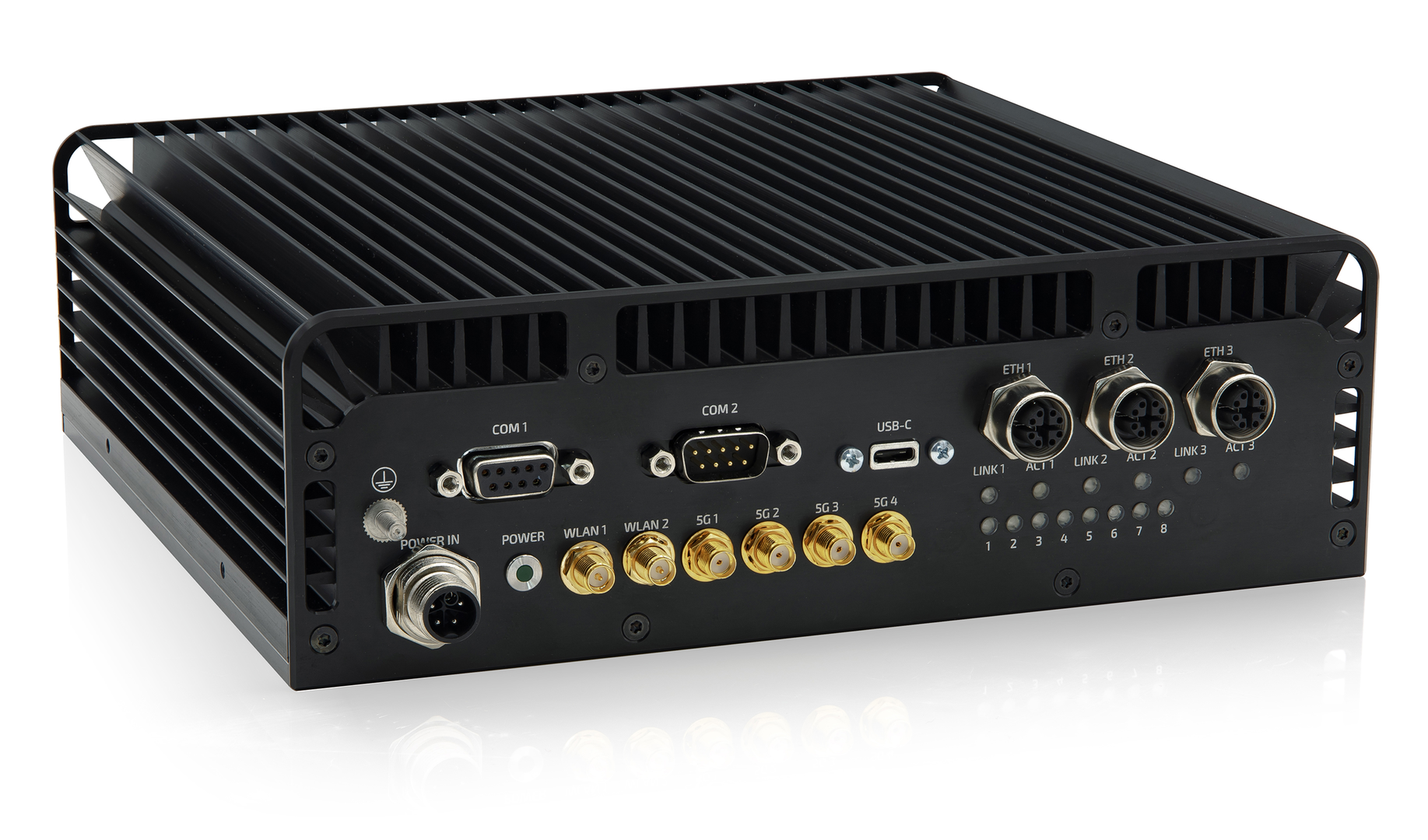 On the front, the KBox R-101 has three Gigabit Ethernet interfaces M12 x-coded, two isolated serial I/Os - 1x RS232 and 1x RS422/485 - as well as a USB-C interface. There are also six cut-outs for antenna connections (SMA, QMA) as well as eight LEDs, which can be used for specific applications, and a power LED.