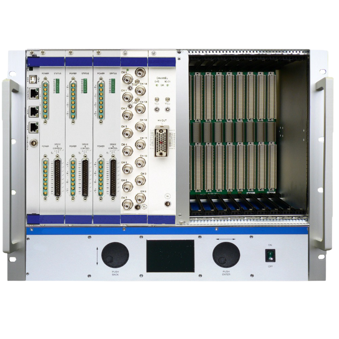 Modular 19″ 8U chassis with up to 10 HV/LV slots, supports integrated backplanes (VME, cPCI), front or rear connectors, Ethernet/CAN/USB control, optional LCD – for power and DAQ.