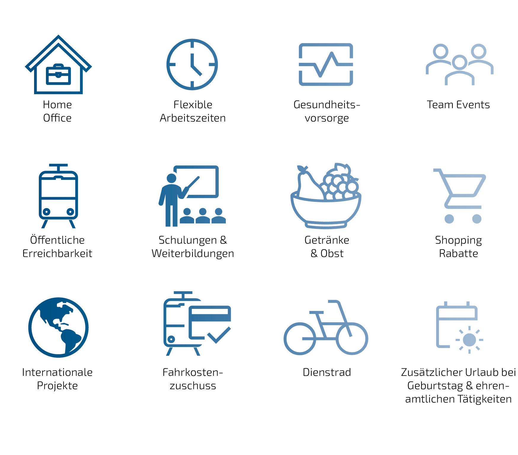 Zudem bieten wir moderne Arbeitszeitmodelle mit flexiblen Arbeitszeiten und die Möglichkeit, im Home-Office zu arbeiten. Für unsere Weiterentwicklung können individuelle Aus- und Weiterbildungsmöglichkeiten in Anspruch genommen werden.