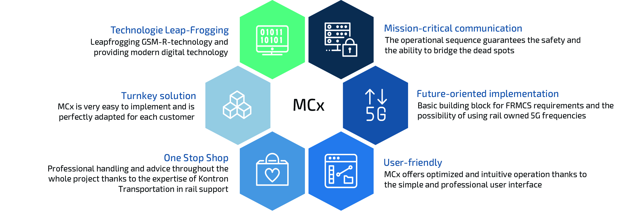 Both solutions are based on the future FRMCS standardization (3GPP, ETSI). The Kontron Transportation MCx solution extends obsolete analog radio communication means with modern "state of the art" train radio functionalities, without the need to develop an own infrastructure.