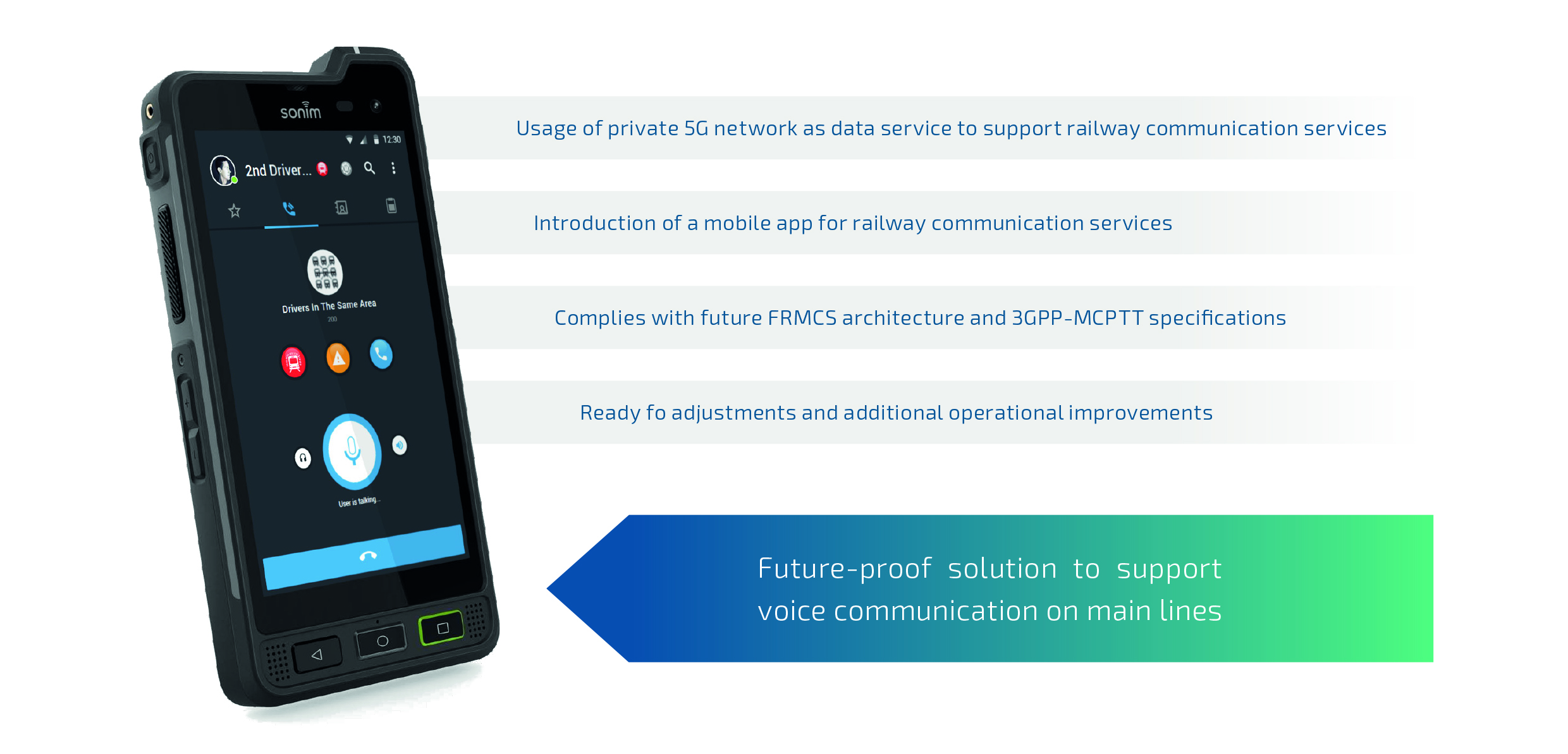 Kontron Transportation is developing the MCx and 5G based FRMCS solution for Main Lines that need to build their own infrastructure. The private 5G networks of the main lines are used as transport medium for the MCx application with GSM-R features such as single call, group call and train emergency call.