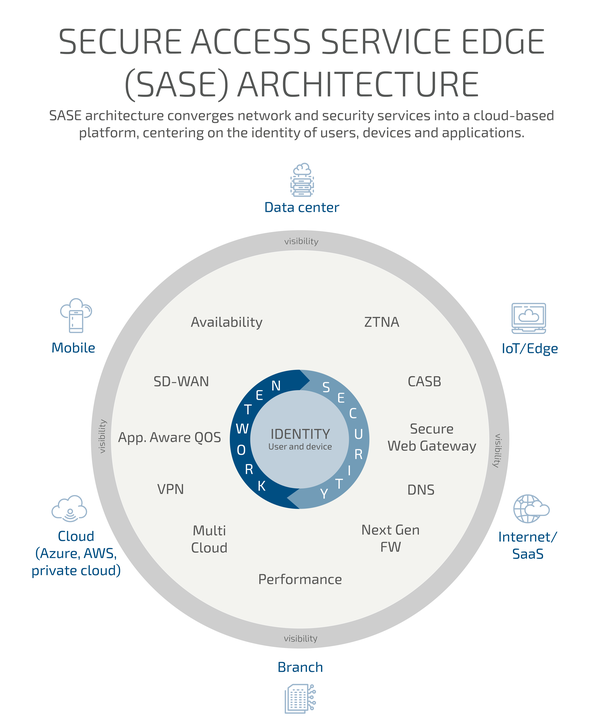 Security is considered end to end. From the end device to the Cloud and to legacy data center with a set of on prem or Cloud-delivered services. Complementary to highly secured SD-WAN, those services include NGFW (Next Generation Firewall Service), ZTNA (Zero Trust Network Access), SWG (Secure Web Gateway Service), CASB (Cloud Access Security Broker), RBI (Remote Browser Isolation) and DLP (Data Leak Prevention). Such features are part of a SASE (Secured Access Service Edge) solution. SASE architecture converges network security services into a cloud-based platform, centering on the identity of users, devices and applications.